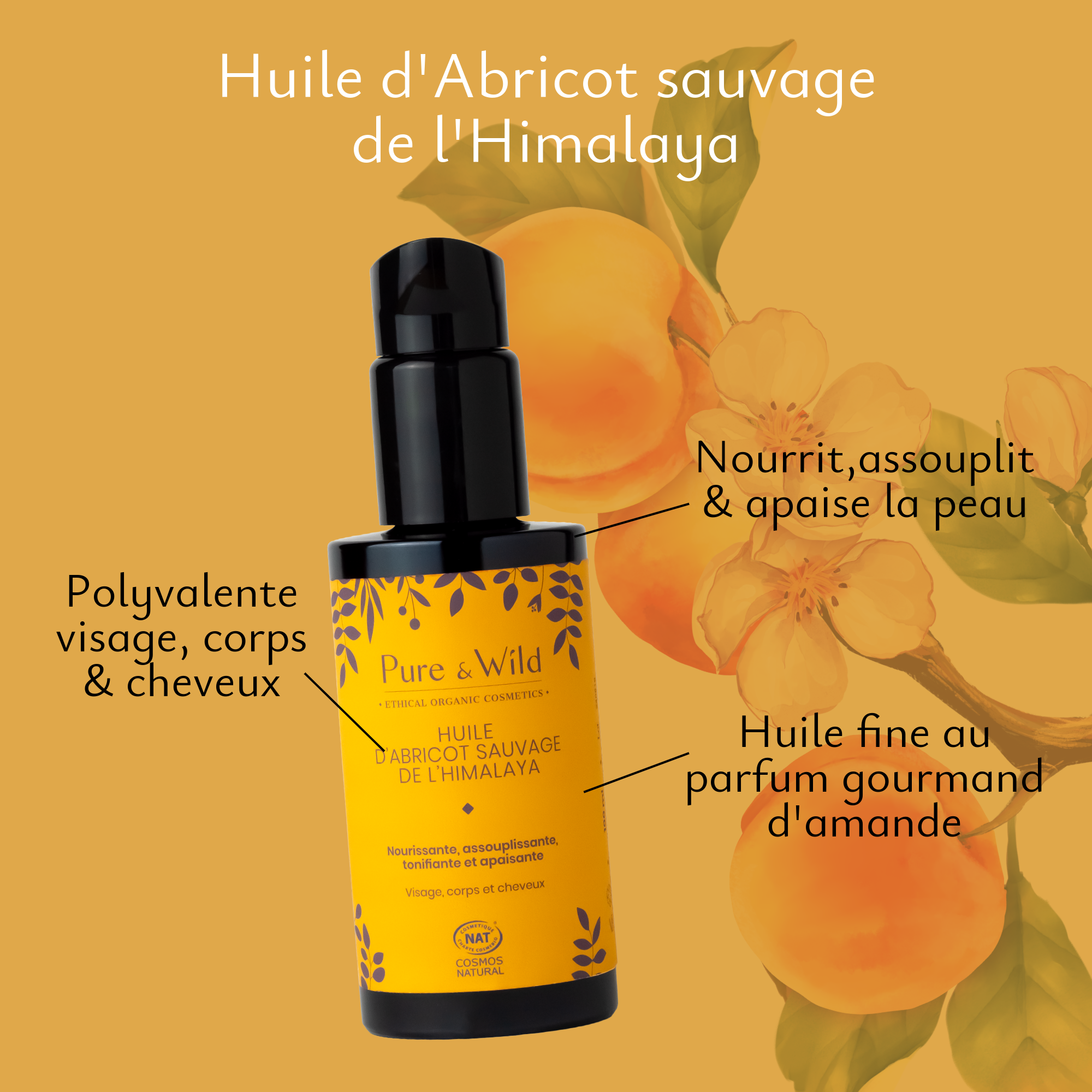 Elle possède une teneur beaucoup plus élevée en vitamines A, E et en acides gras essentiels que les taux trouvés dans les huiles d'abricots cultivés. Elle convient à toutes les peaux qu'elles soient sèches, sensibles avec rougeurs, peaux mixtes à tendance acnéique ou matures.
